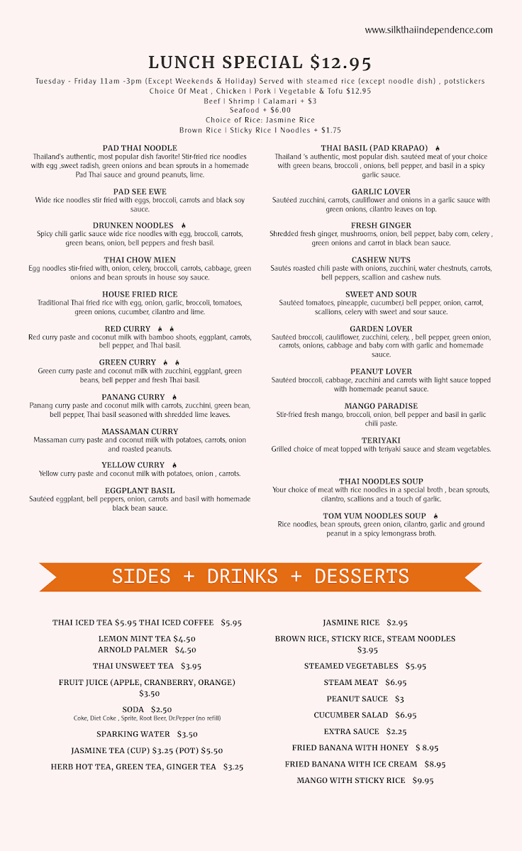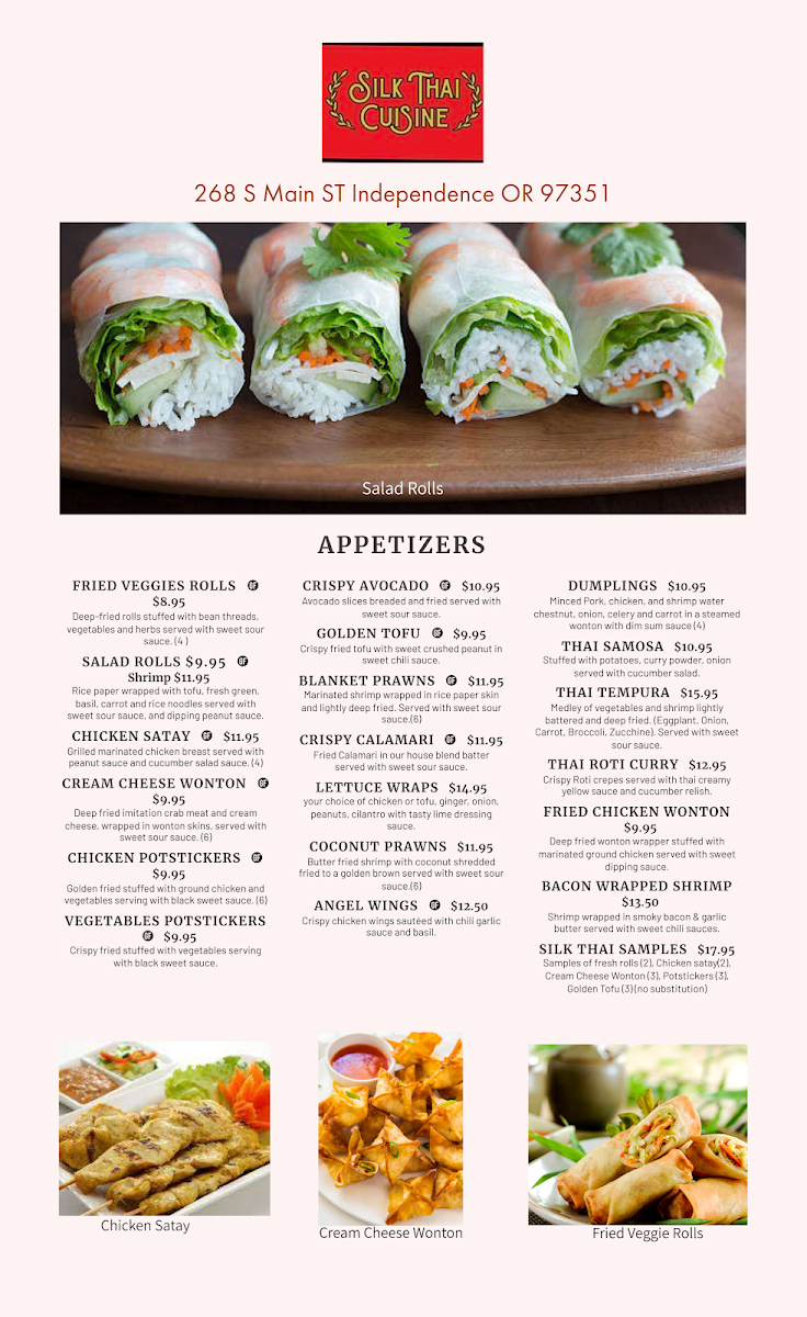 Welcome to Silk Thai Cuisine, a hidden gem located at 268 S Main St, Independence, OR. This vibrant restaurant captures the essence of authentic Thai flavors, making each visit a culinary adventure. The extensive menu features crowd favorites like Pad Thai and Pineapple Fried Rice, both lauded for their generous portions and rich taste. Customers rave about the Crispy Duck Curry and Pad See Ew, which strike the perfect balance of spice and freshness.